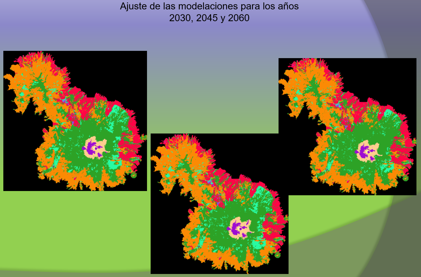 En este caso se optó por usar un programa que cumpliera con las característica de análisis, en el que destaca el programa TerrSet, el cual es un software de análisis con la capacidad de generar escenarios futuros, solicitando datos de entrada de tiempos anteriores aunados con detección de zonas de transición, factores endógenos y exógenos que influyan en el comportamiento del cambio de uso de suelo, en la que puede destacar las carreteras, asentamientos humanos, bancos de material, altimetría, veredas, plagas, incendios y hasta las reforestaciones, entre los más importantes. Como resultado de esta información se generaron 3 proyecciones para los años 2030, 2045 y 2060.